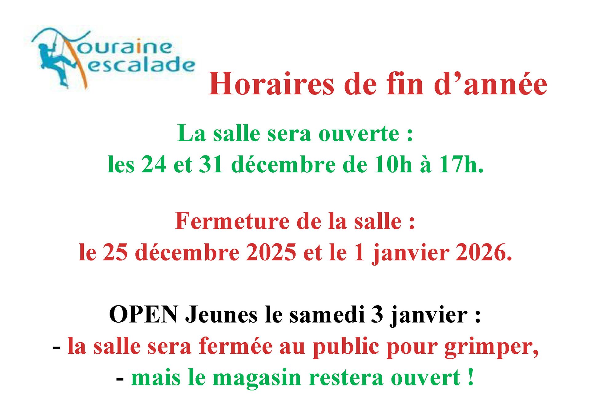 La salle sera fermée le 25 décembre et le 01 janvier.